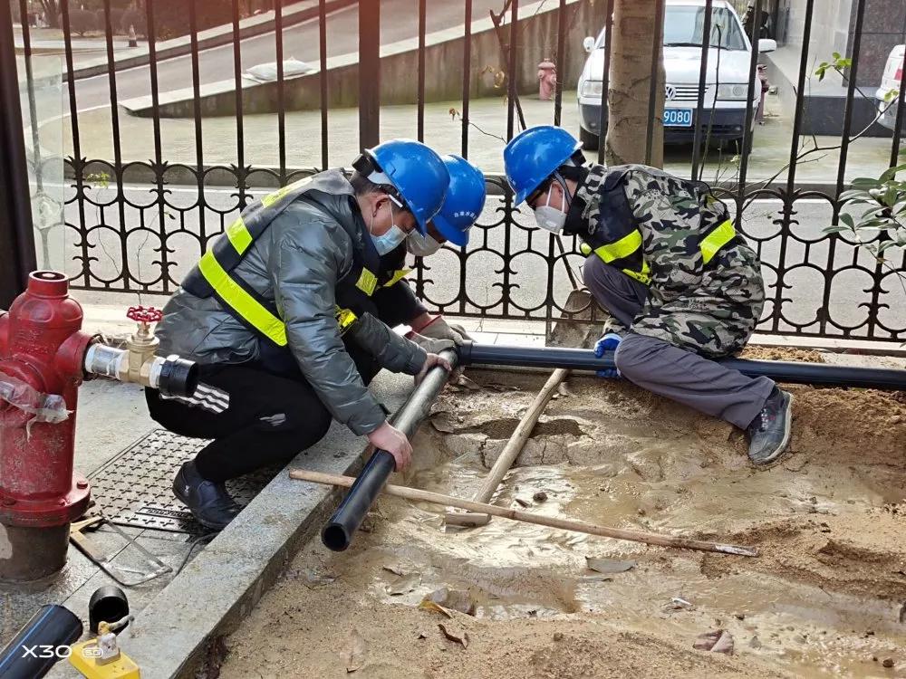 在抗擊疫情特殊時(shí)期,公司克服材料采購(gòu)、車(chē)輛調(diào)度、人員安排等困難,特事特辦,當(dāng)天便迅速安排公司客服中心、設(shè)計(jì)公司以及建設(shè)工程公司相關(guān)負(fù)責(zé)人趕赴現(xiàn)場(chǎng),進(jìn)行勘測(cè)設(shè)計(jì)、制定方案并組織材料施工,僅5小時(shí)便完成外部供水管道敷設(shè),具備了通水條件。