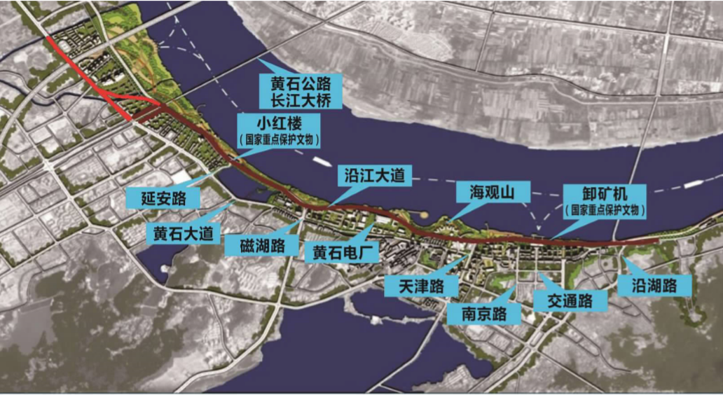 途中上跨上港閘、下穿黃石長江大橋,途經小紅樓、黃石電廠、海觀山賓館及卸礦機文物保護舊址。