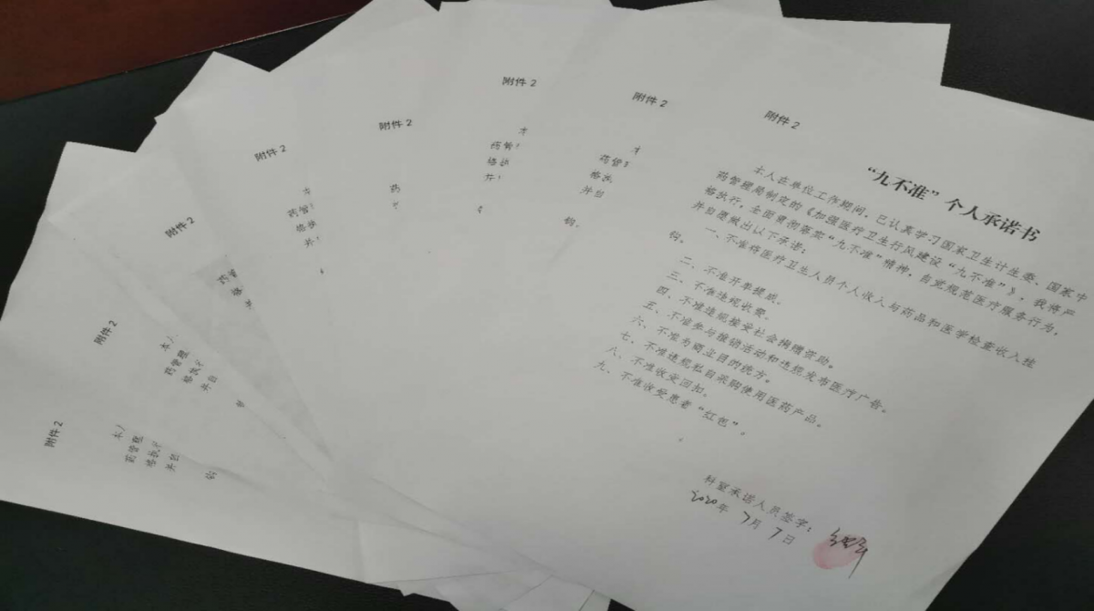 簽訂“九不準”承諾書。組織醫務人員重學《加強醫療衛生行風建設“九不準”》,簽訂“九不準”個人承諾書,遏制不正之風,加強行風建設。
