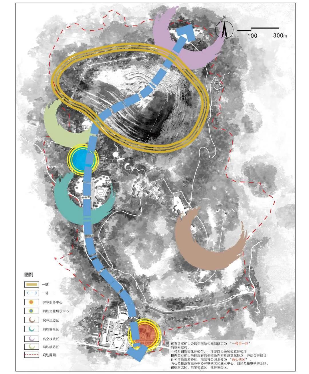 礦山公園空間結構規劃確定為“一帶串一環,兩心四區”,一帶是指鋼鐵文化體驗帶;一環是指露天采坑極致體驗環;兩心是指游客服務中心,鋼鐵文化展示中心;四區是指鋼鐵游樂區、鋼鐵演藝區、高空極致區、槐林生態區。