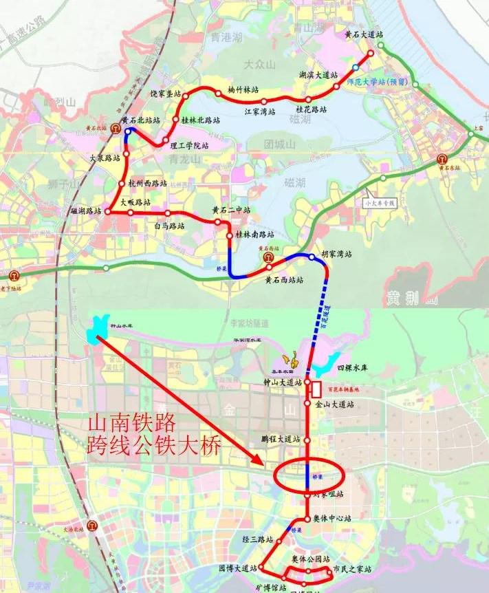 據悉,山南鐵路跨線橋分三幅并列設計,兩側各11.5米寬為市政橋,中間8米為有軌電車專用橋,設計為雙向四車道,工期為15個月。該橋建成后,將為市民驅車前往大冶湖核心區提供新的路線,節省約8-10分鐘車程,提升城市內部交通效率。