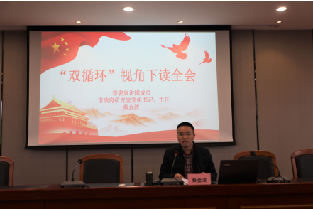 秦金波以《“雙循環”視角下讀全會》為題,以讀全會、讀格局、讀黃石為線索,從“三個規定動作”“三個特殊”“三個新”讀全會,從提出背景、形成過程、基本內涵、重點任務讀格局,從黃石的歷史定位、黃石的發展定位、黃石的施工圖讀黃石,用生動活潑的語言、旁征博引的案例、深入淺出的講解,闡釋了黨的十九屆五中全會的全局性和歷史性意義,科學分析了黃石發展思路和施工藍圖,同時為城發集團“十四五”規劃的制定提出了意見和建議。
