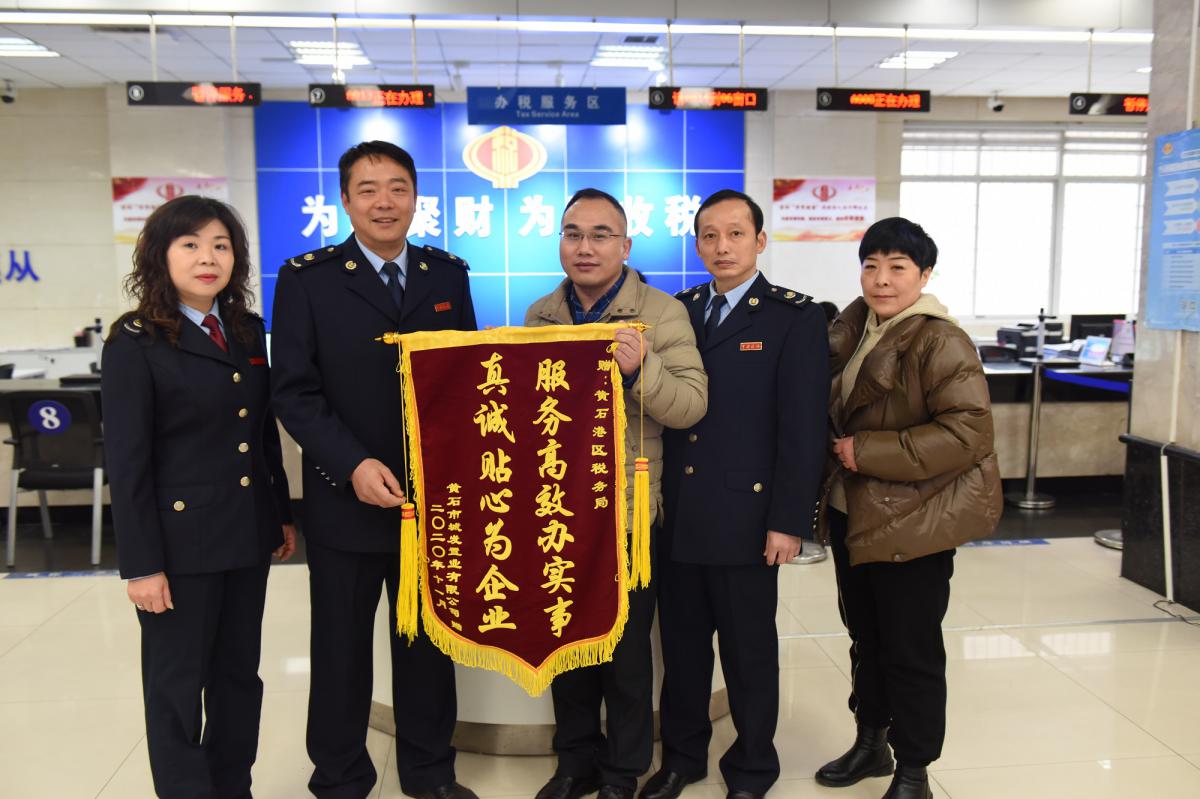 12月16日上午,城發置業(停車、教育)公司總經理程勇向黃石港區稅務局送去一面錦旗,感謝黃石港區稅務局幫助公司享受增值稅期末留底稅額退稅優惠政策,實現退稅590萬元。
