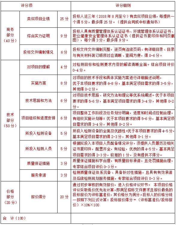 滿分為100分。其中商務部分為40分,技術部分為40分,價格部分為20分。綜合得分最高值為第一中標候選人。